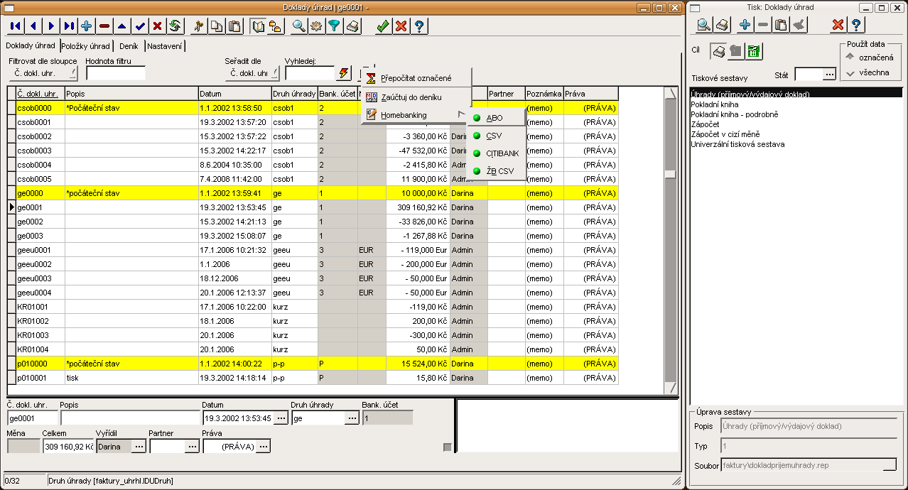 Z přijatých faktur lze jednoduchým způsobem generovat příkazy k úhradě a ty pak následně pomocí funkcí pro homebanking poslat elektronickou formou do banky. Evidence úhrad dokladů umožňuje zpracování bankovních účtů a pokladen. V systému lze definovat neomezený počet bankovních účtů a pokladen. Funkce homebankingu umožní uživatelům elektronické načítání úhrad z bankovních výpisů.