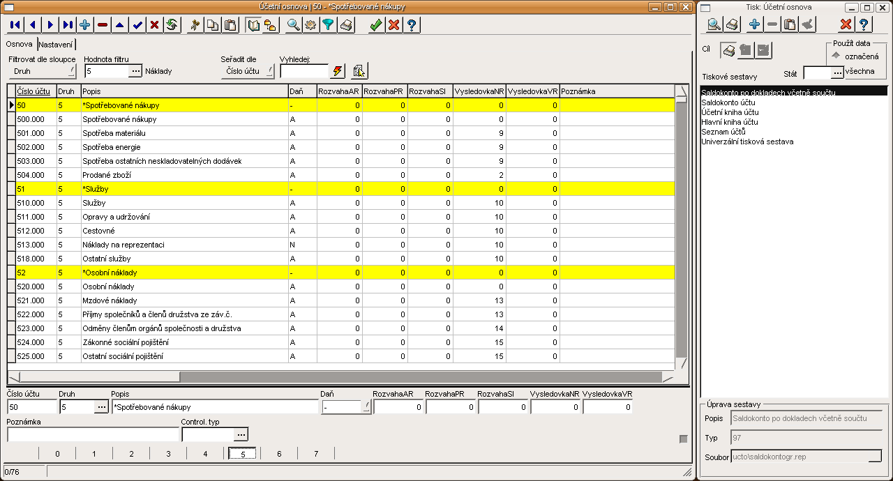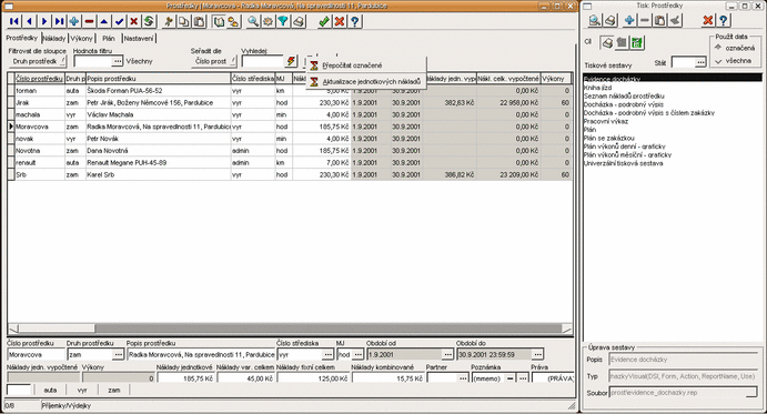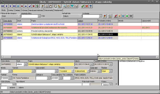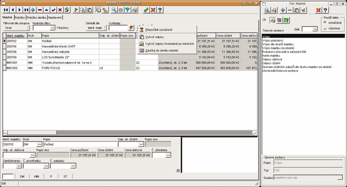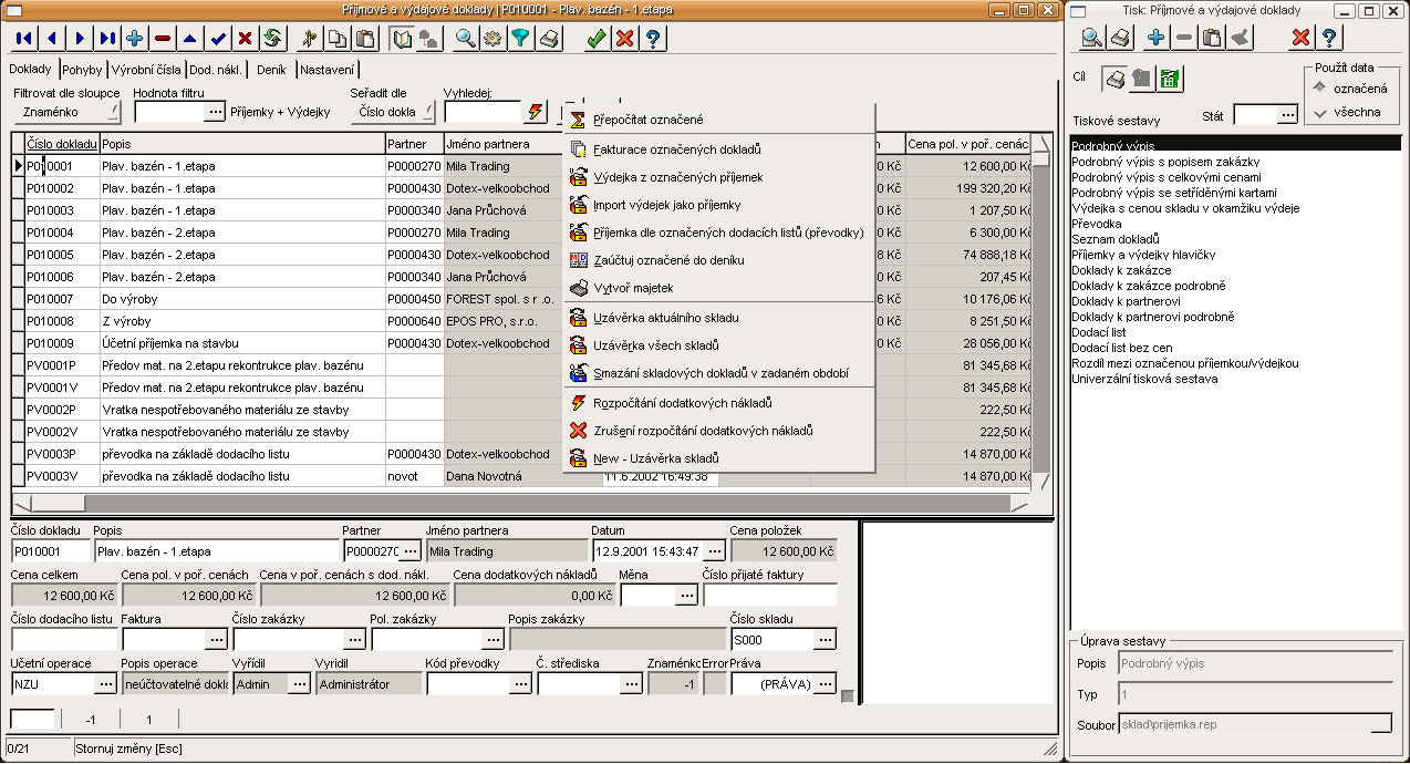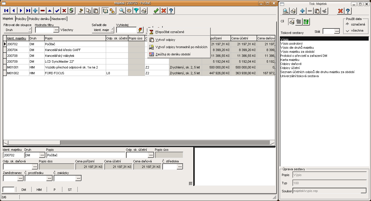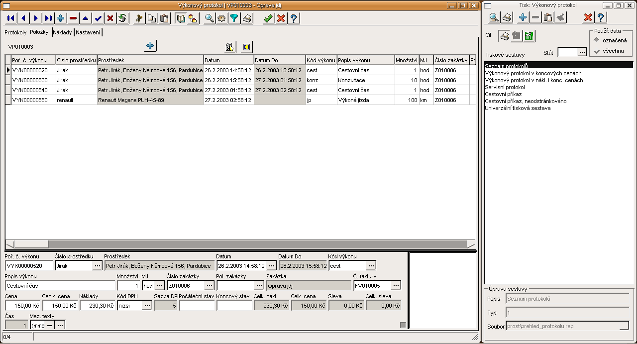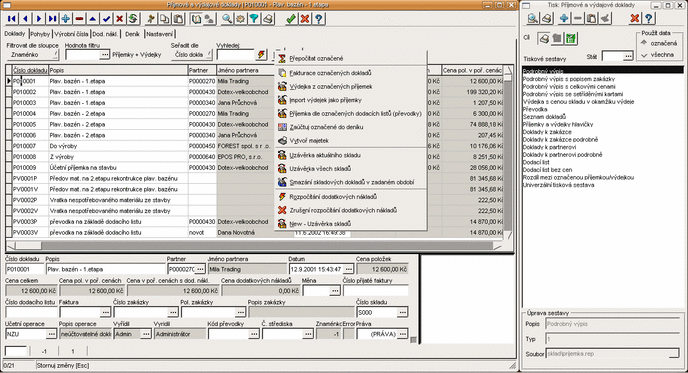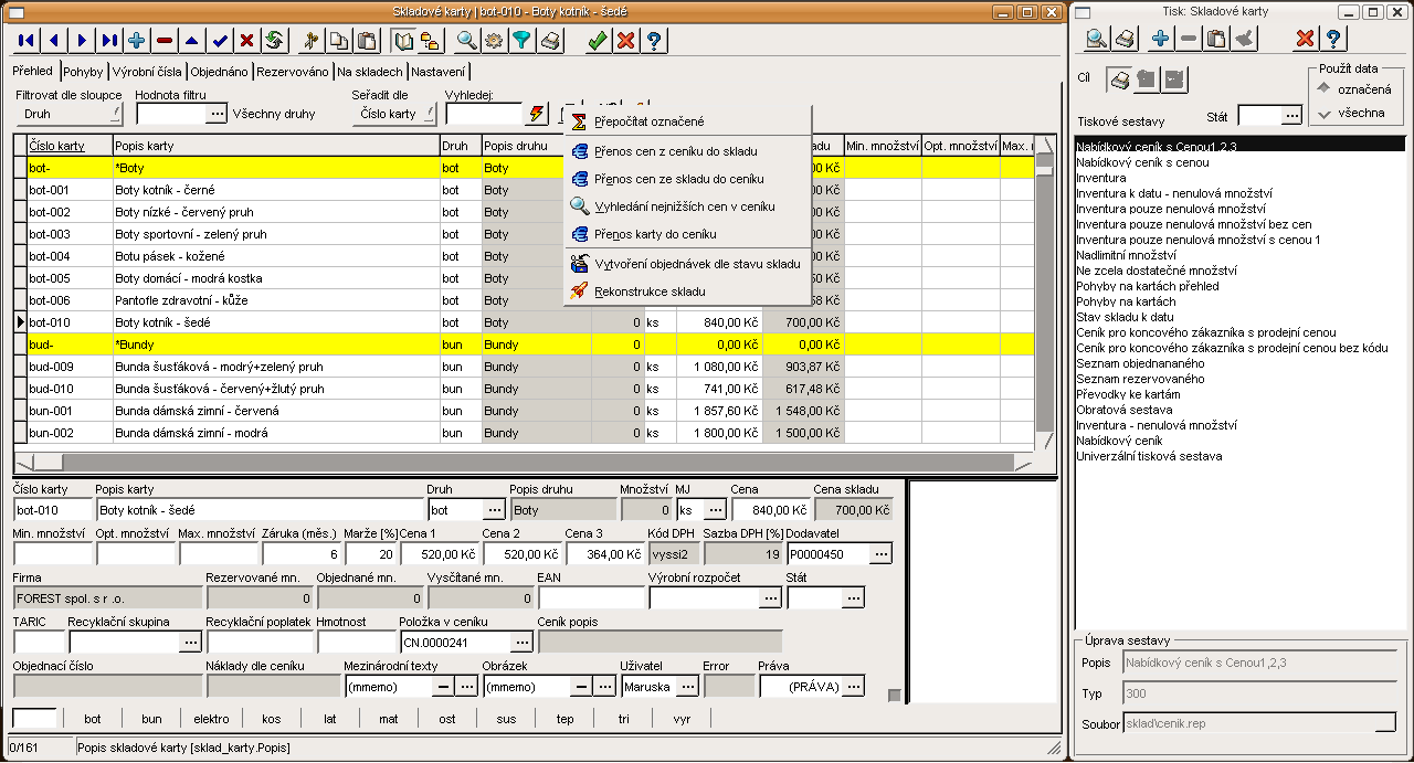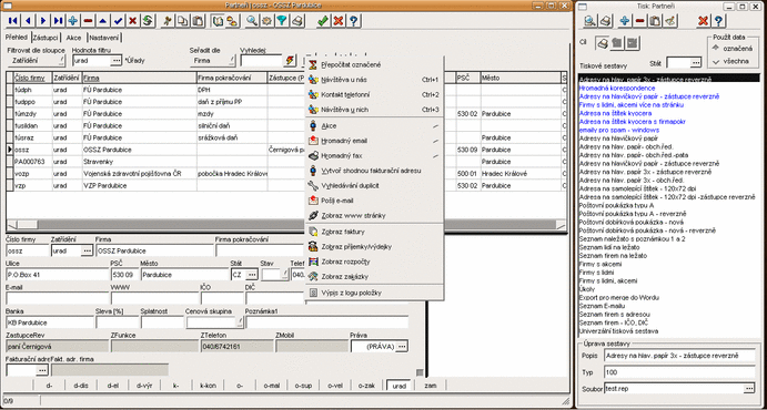 Evidence zakázek, funkce lokálního menu a tiskové sestavy