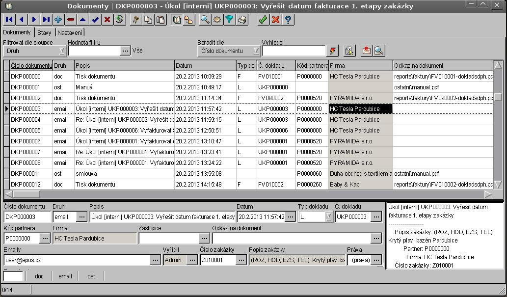 Základní okno modulu Dokumenty