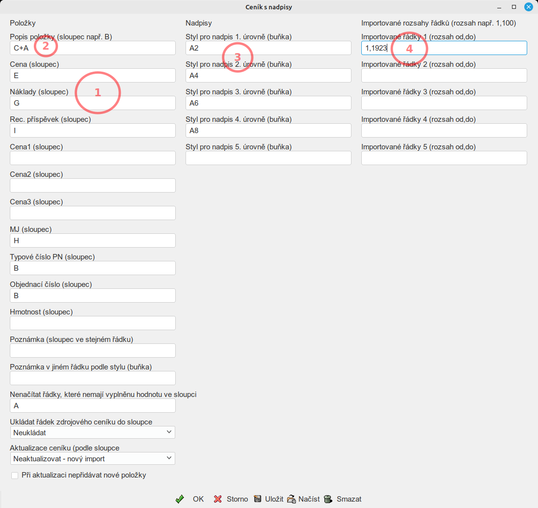 - uložený program lze použít pro aktualizaci ceníku (v šabloně je volba Aktualizace ceníku podle sloupce)