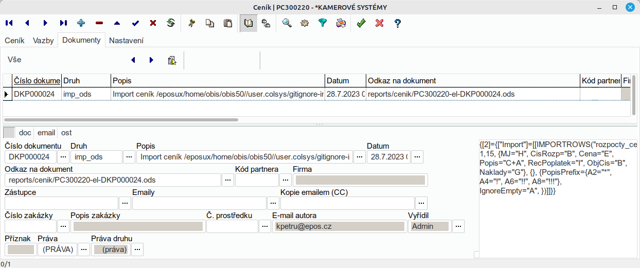 - program importu a impotovaný zdrojový soubor se uloží u první položky (prvního řádku) ceníku v záložce dokumenty