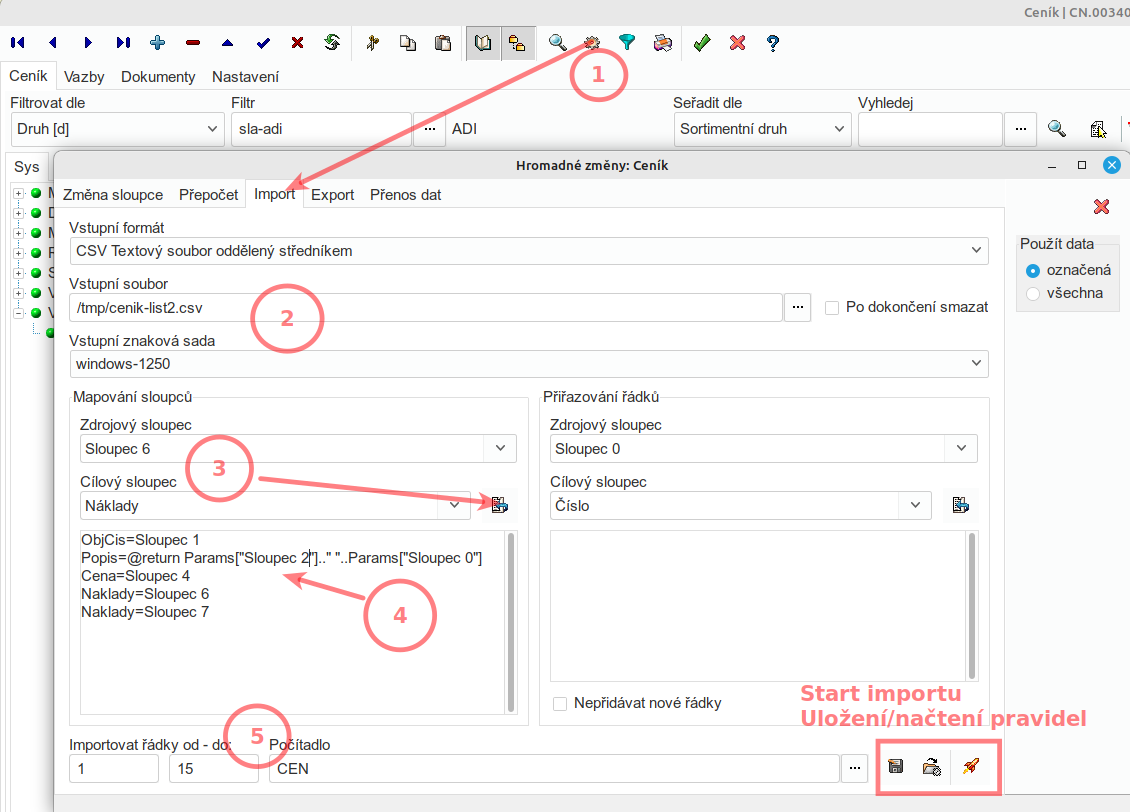 - v ceníku tlačítkem hromadných změn (1), záložka import otevřeme dialog