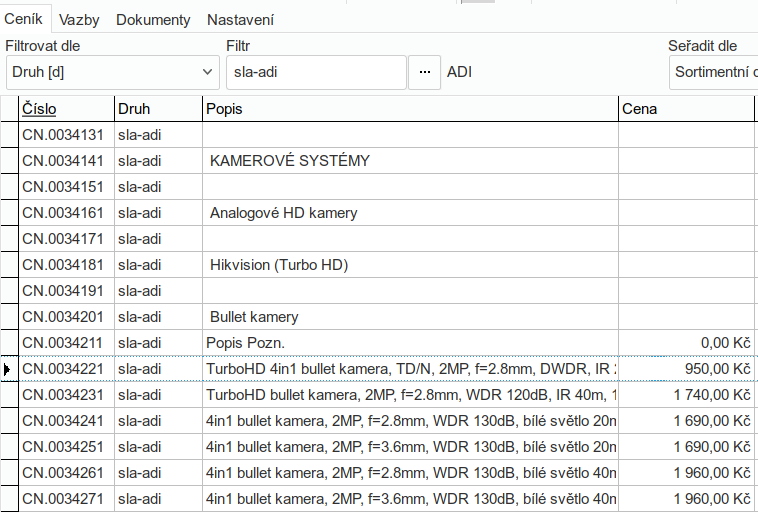 - výsledný import pak obsahuje požadované nadpisy, pomocí kterých lze vytvořit navigátor (stromovou strukturu nadpisů v ceníku)