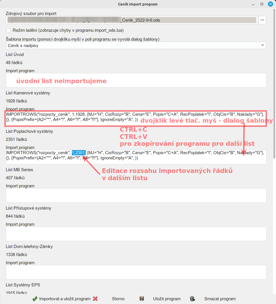 - v následujícím dialogu importu lze dvojklikem myší v poli pro požadovaný list vyvolat šablonu pro tvorbu programu