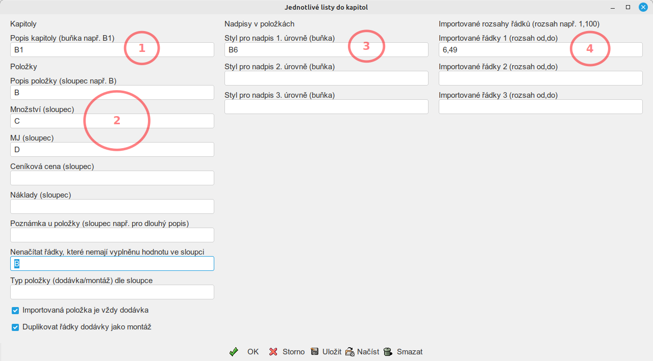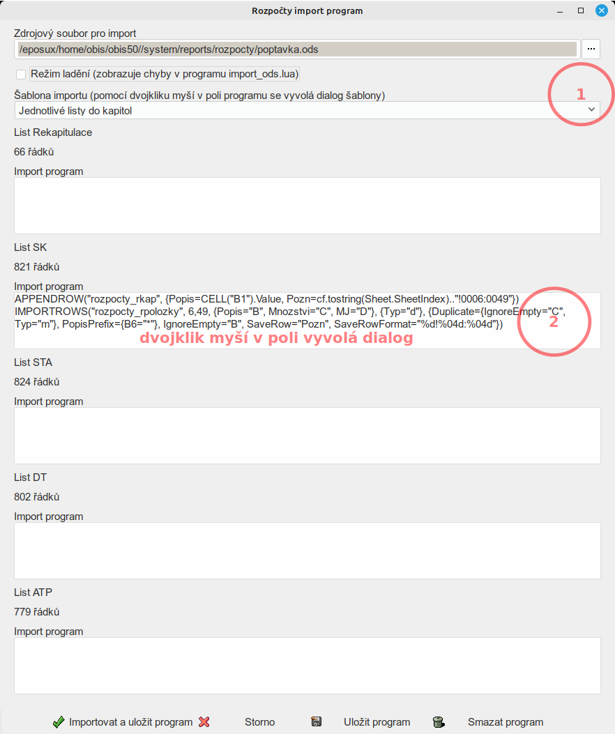 - zobrazí se okno ve kterém je pro každý list jedno pole pro importovací program