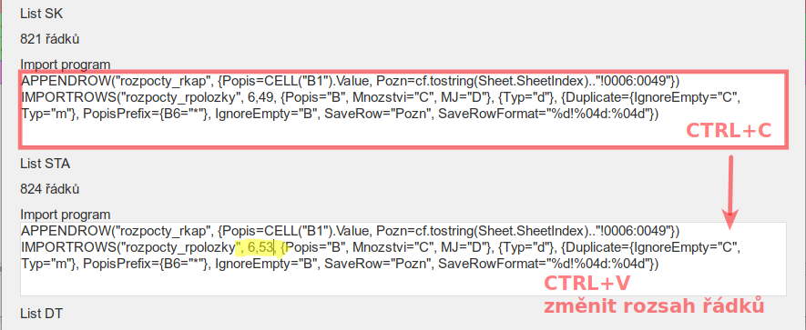 - pro každý list lze vytvořit program pomocí šablony a dialogu nebo lze kód programu zkopírovat do dalšího pole a jen opravit rozsah importovaných řádků (pokud má další list podobně formátovaný)