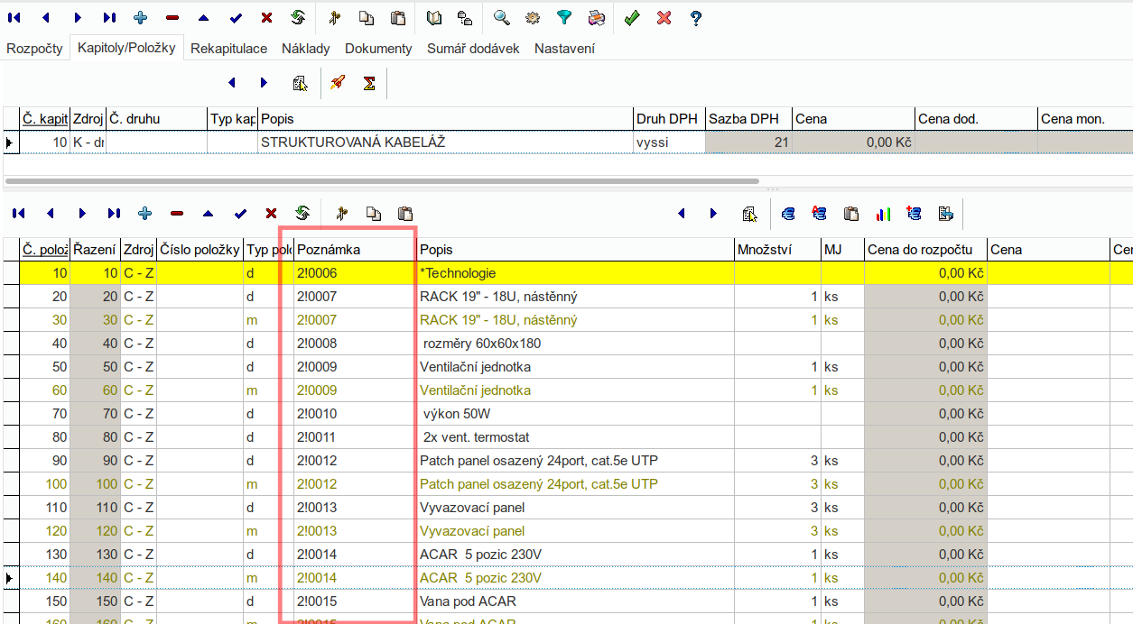 - naceňené položky v rozpočtu pak zachovají původní popis z poptávky, jsou propojeny s ceníkovou položkou, doplní se ceny a v náhledu se zobrazí popis z ceníku OBISu