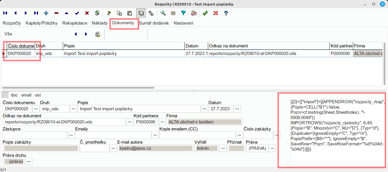 - importovací program je pak uložen v záložce dokumenty u rozpočtu