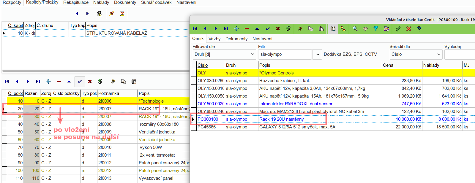 - po doplnění položky se v rozpočtu kurzor posune na další řádek a do něj se vloží navázaná montáž