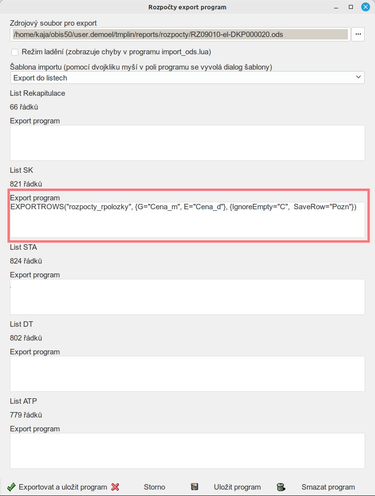 - v dialogu exportu se opět dvojkikem myší vyvolá šablona pro tvornu programu pro export