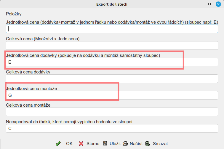 - lze vybrat export jednotkových nebo celkových cen a lze se řešit situaci kdy je dodávka a montáž v poptávce na jednom řádku