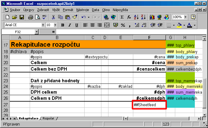 V excelu se bandy nastavují tak, že si buňku pojmenujeme podle požadoveného bandu (obr. - 1). V buňce pak nastavíme odkaz na pole hodnot, které se budou tisknou v daném bandu (obr. - 2). Hodnoty, které chceme tisknou z OBISu se do jednotlivých bandů vkládají s počátečním znakem # - jedná se o tzv. fieldy (obr. - 3). Funkce se vkládají se dvěma znaky ##. Statické texty (nadpisy, popisky, atd.) jsou v šabloně samostatně, bez jakéhokoliv znaku (obr. - 4).